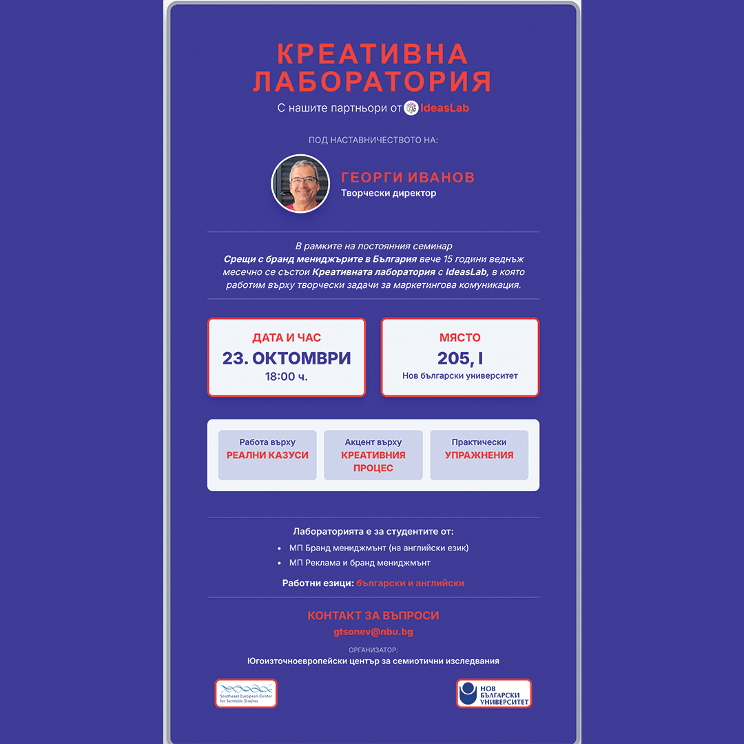 В рамките на постоянния семинар Срещи с бранд мениджърите в България вече 15 години веднъж месечно се състои Креативната лаборатория с IdeasLab, в която работим върху творчески задачи за маркетингова комуникация.