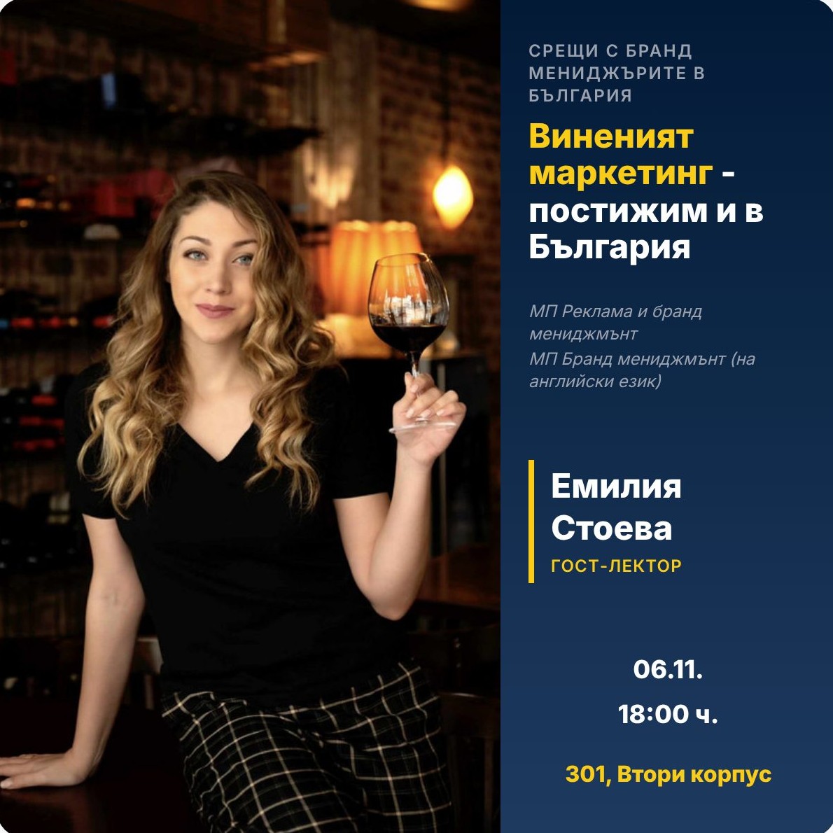 Този семинар е посветен на пазара на качественото вино в България и на предизвикателството да се маркетира винената култура. Акцент ще бъдат гурме и винените събития.